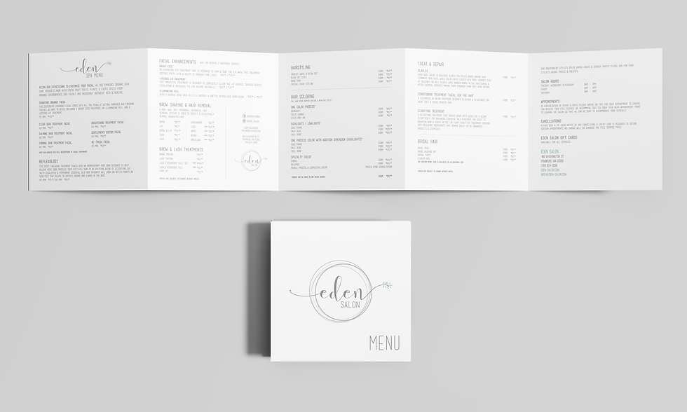 Eden salon is a newly established hair salon, located in Pembroke, MA. Eden Salon’s branding was created with a simplistic & organic style. The client had hoped for a neutral color palette in the branding that would correlate with the rest of the salon itself. Salon menus, business cards, appointment cards, gift certificates, & vouchers were created while maintaining consistency throughout all of the designs.